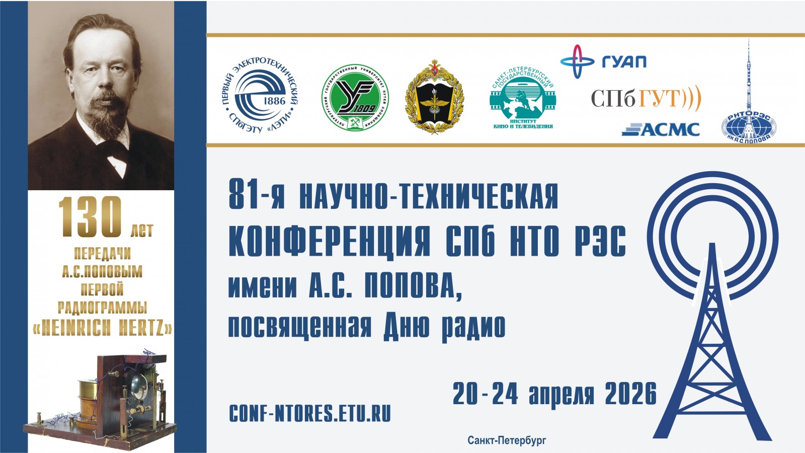 20 - 24 апреля 2026 года в ряде ведущих вузов города пройдет 81-я научно-техническая конференция Санкт-Петербургского НТО РЭС им. А.С. Попова, посвященная Дню радио.